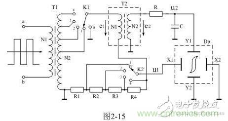 要對(duì)鐵磁材料的磁滯回線(xiàn)的參數(shù)進(jìn)行嚴(yán)格測(cè)試是比較麻煩的,不過(guò)用示波器顯示磁滯回線(xiàn)則比較簡(jiǎn)便。圖2-15是用示波器測(cè)量變壓器鐵芯磁滯回線(xiàn)的原理圖。在圖2-15中,變壓器T1為信號(hào)源,通過(guò)K1選擇變壓器T1次級(jí)線(xiàn)圈的抽頭就可以改變信號(hào)源的電壓輸出;T2為待測(cè)變壓器樣品,Dp為示波器;R1、R2、R3、R4為顯示磁場(chǎng)強(qiáng)度H的取樣電阻,取樣電壓u1作為示波器X軸偏轉(zhuǎn)顯示輸入電壓,通過(guò)K2可以選擇取樣電壓輸出,從而可以改變示波器X軸偏轉(zhuǎn)顯示的寬度;電阻R和電容C為積分電路,積分電壓u2由電容C兩端輸出,作為示波器Y軸偏轉(zhuǎn)顯示輸入電壓,以顯示磁通密度B。