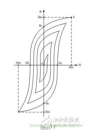 如果再使H逐漸退到零,則與此同時(shí)B也逐漸減少。然而H和B對(duì)應(yīng)的曲線(xiàn)軌跡并不沿原曲線(xiàn)軌跡a-0返回,而是沿另一曲線(xiàn)下降到Br,這說(shuō)明當(dāng)H下降為零時(shí),鐵磁物質(zhì)中仍保留一定的磁性,這種現(xiàn)象稱(chēng)為磁滯,Br稱(chēng)為剩磁。將磁場(chǎng)反向,再逐漸增加其強(qiáng)度,直到H=-Hc,磁通密度消失,這說(shuō)明要消除剩磁,必須施加反向磁場(chǎng)Hc。Hc稱(chēng)為矯頑力。它的大小反映鐵磁材料保持剩磁狀態(tài)的能力。圖2-16表明,當(dāng)磁場(chǎng)按Hm→0→-Hc→-Hm→0→Hc→Hm次序變化時(shí),B所經(jīng)歷的相應(yīng)變化為Bm→Br→0→-Bm→-Br→0→Bm。于是得到一條閉合的B~H曲線(xiàn),稱(chēng)為磁滯回線(xiàn)。所以,當(dāng)鐵磁材料處于交變磁場(chǎng)中時(shí)(如變壓器中的鐵芯),它將沿磁滯回線(xiàn)反復(fù)被磁化→去磁→反向磁化→反向去磁。在此過(guò)程中要消耗額外的能量,并以熱的形式從鐵磁材料中釋放,這種損耗稱(chēng)為磁滯損耗。前面已經(jīng)證明,磁滯損耗與磁滯回線(xiàn)所圍面積成正比。