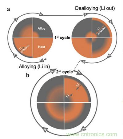 在第1次合金化過程中,Li+首先進入從活性物質顆粒表面,產生濃度差。然后以進一步向顆粒內部擴散,形成Li+濃度梯度分布。但是,顆粒內部仍有Li+難以到達的區域;