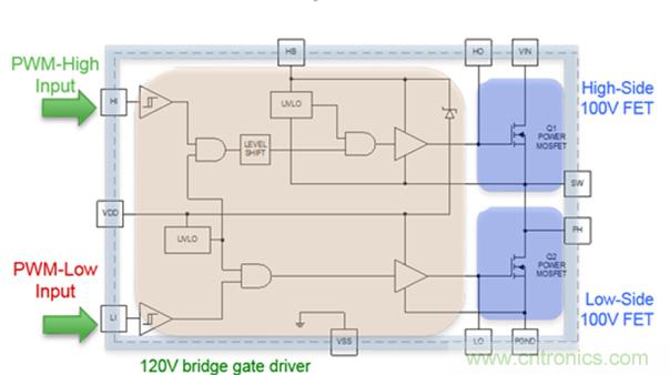 FDMF8811集成了一對100V的功率MOSFET、120 V驅(qū)動器IC和一個自舉二極管到6.0 mm x 7.5 mm 的PQFN封裝。