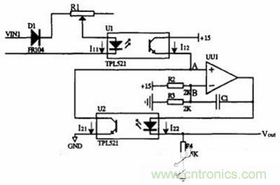 VIN 即電池單體電壓,經過R1與光耦中的發光二極管形成回路,將電壓信號(VIN)轉換為電流信號( I11)。I11與I21有一定比例關系I11∝ I21。UU1 在這里作為比較器使用。當A點電壓Va大于B 點電壓Vb,UU1 就輸出高一些的電壓值,當A 點電壓Va低于B 點電壓Vb,UU1 就輸出低一些的電壓值。在整個電壓采樣電路中,比較器形成一個反饋。使A、B 兩點的電壓值保持一致。這樣做的目的是B 點電壓顯然是15∕2=7.5v, Va= Vb =7.5v,說明上下兩個光耦中的三極管導通情況一樣。這樣,三極管的導通情況是受控于發光二極管的。可知當I21= I22時, I11= I22。這樣,VIN∕= I11= I22= Vout∕R4。可見Vout 與VIN 成比例。