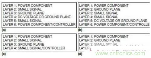 圖1a和1c分別是六層和四層開關(guān)電源PCB的不良層結(jié)構(gòu)。這些結(jié)構(gòu)將小信號層夾在大電流功率層和地層之間,因此增加了大電流/電壓功率層與模擬小信號層之間耦合的電容噪聲。