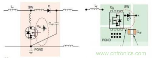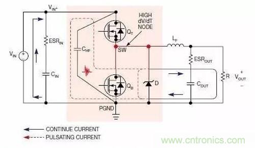 圖4顯示的是升壓轉(zhuǎn)換器中的連續(xù)電流回路與脈沖電流回路。此時,應(yīng)在靠近MOSFET QB與升壓二極管D的輸出端放置高頻陶瓷電容CHF.