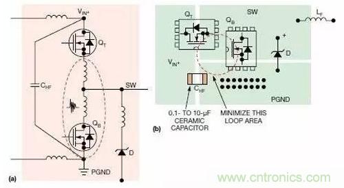 圖5.本圖顯示的是升壓轉(zhuǎn)換器中的熱回路與寄生PCB電感(a);為減少熱回路面積而建議采用的布局(b)。