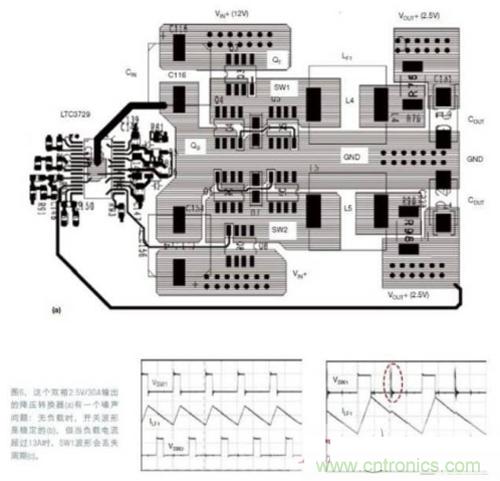 圖6和圖7(略)提供了一個同步降壓電路的例子,它強調(diào)了去耦電容的重要性。圖6a是一個雙相12VIN、2.5VOUT/30A(最大值)的同步降壓電源,使用了LTC3729雙相單VOUT控制器IC.在無負載時,開關(guān)結(jié)點SW1和SW2的波形以及輸出電感電流都是穩(wěn)定的(圖6b)。但如果負載電流超過13A,SW1結(jié)點的波形就開始丟失周期。負載電流更高時,問題會更惡化(圖6c)。