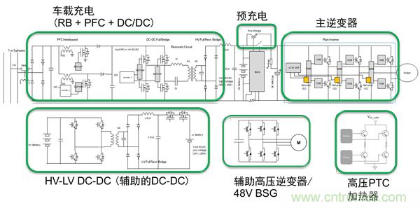 HEV/EV的重點應用有:車載充電器、電池管理、牽引逆變器、輔助逆變器、48 V皮帶啟動發電機(BSG)和DC-DC轉換器。