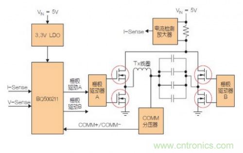 Qi發(fā)射器控制器擁有輸入功率限制選項,至發(fā)射器的輸入電流可被限制在500mA,從而允許通過USB端口或小型電源適配器供電運行。bq500211發(fā)射器的穩(wěn)壓電路有3.3V的LDO穩(wěn)壓器構(gòu)成輸出芯片供電,LDO的最大優(yōu)勢就是PNP管只會帶來很小的導(dǎo)通壓降,滿載的跌落電壓的典型值小于500mV,輕載時的壓降僅有10~20mV。LDO的壓差為:Vdrop = Vsat (LDO 穩(wěn)壓器)。