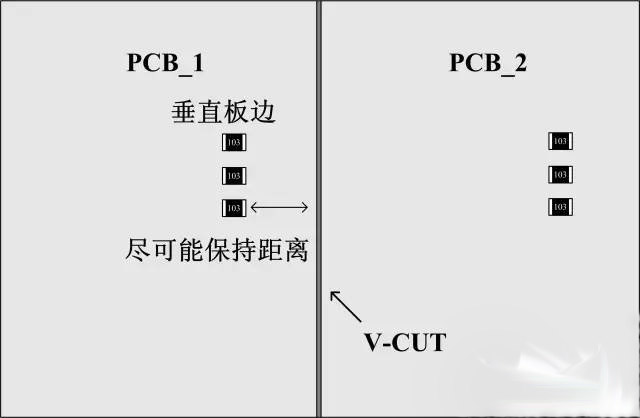 貼片電阻的另外一種常見的損壞是機械損傷后呈開路狀態,后續導致電路異常(器件外觀有可能正常)。下面是幾個小建議:1、如果是手折板的話(極少使用,無法機器分析,毛刺大),貼片電阻長度方向平行于PCB板邊,零件受的應力小;如果是V-CUT的話,貼片器件長度方向垂直于PCB邊,零件破裂可能性較小。2、元件如果與連接處垂直,到連接處的距離建議要≥4mm,若平行,距離建議要≥1.5mm.3、在成本允許的情況下,適當加厚PCB板厚度,特別是面積比較大的板子。(下面是兩個簡單的示意圖,實際情況請實際分。)