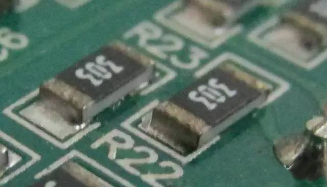下圖是兩顆電極氧化了的貼片電阻(電極表面有點黑),別看它們現在好好的,一旦電路進入了惡劣的工作狀態(高溫高濕),電阻就會因為虛焊而使電路工作在不可預測的狀態,繼而損壞。
