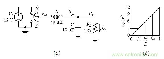 圖1:(a)降壓轉換原理(fS和D表示開關切換的頻率和占空比);(b)VO是D的函數。