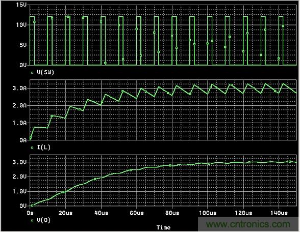 由于0 < D < 1,很明顯電路可以作為一種分壓器,不管負載RL所需的電流如何,公式(1)都保持不變。最初,電感電流的一大部分對C進行充電,電路一旦達到穩定狀態,電容電流將平均為零,因此電感提供的平均電流IL等于負載要求的平均電流IO。在上面的例子中,IL= IO= VO/RL= 3A。