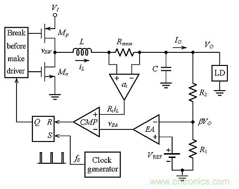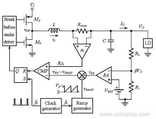 圖3:不帶斜率補償的PCMC降壓轉換器的電路原理圖。