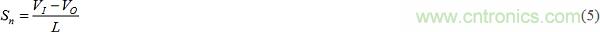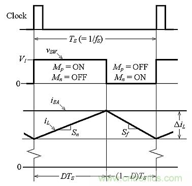 當一個時鐘脈沖置位觸發器時,開始一個周期。這將關閉Mp開關,使vSW=VI。在該周期的這一部分(在圖4中表示為DTS),電感器電流iL以斜率Sn上升,由iL-vL電感法則掌控,或Sn=diL/dt=vL/L。在這段時間,我們得到vL=VI– VO,所以: