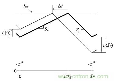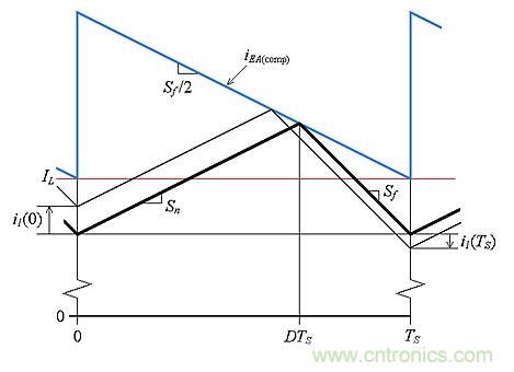 這樣,我們僅以電流形式就可以顯示一個周期,如圖4所示。現在,復位觸發器打開Mp開關,同時關閉Mn開關,使vSW= 0。在表示為(1–D)TS的周期其余部分,我們有vL=0–VO,所以iL以Sf的斜率下降,因此有: