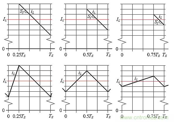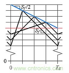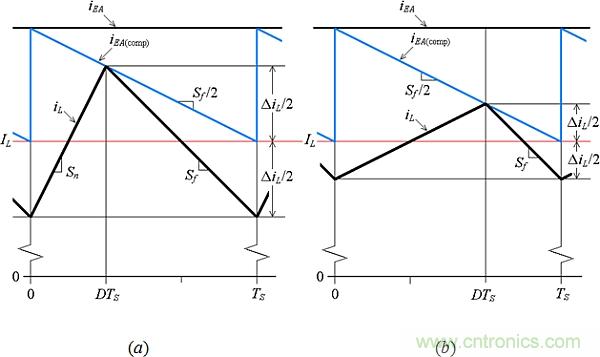 回來看圖5,我們觀察到,如果希望圖5b保持與圖5a相同的iL值,需要減小圖5b的iEA值,以便“下壓”iL波形,直到各IL對齊。那么, iEA需要減到多少呢?為了回答這個問題,需要畫出三個不同D值所需的iL波形。如圖7所示,我們從頂部繪制iL的下降斜坡開始,以相同的IL為垂直中心,并且全具有相同的斜率Sf=-VO/L。接下來,通過繪制上行斜坡來完成iL波形,如圖7底部所示。最后,將這三張圖疊加,如圖8所示,并觀察到峰值軌跡斜坡的斜率為Sf/2 = –VO/2L。