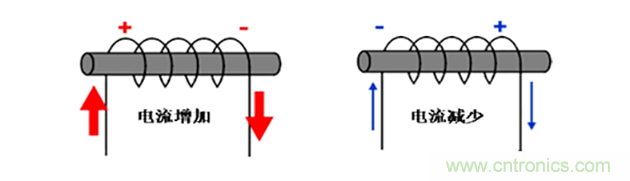 當交流電通過電感時,電流產生的磁場將其他的繞線切隔,因而產生反向電壓,從而阻礙電流變化。反之當電流減少時,則向電流增加的方向產生。