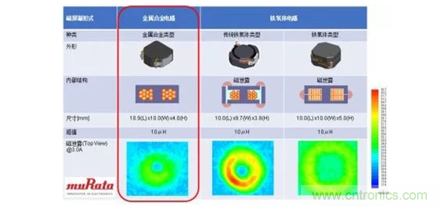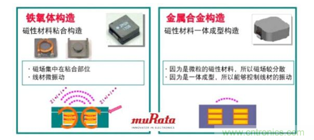 對于金屬合金構造的電感來說,因為形成線圈的磁性材料是微粒的,所以磁場較分散;一體成型構造也能夠控制線材的振動,從而很難產生嘯叫問題。