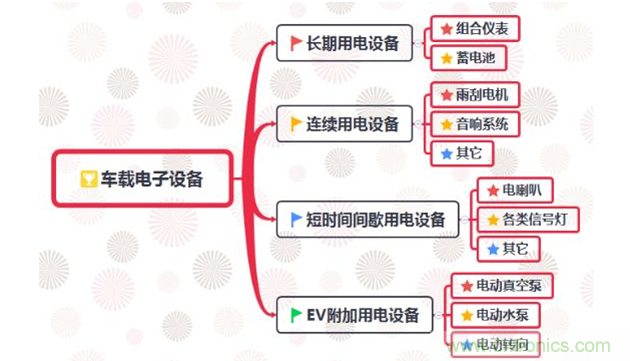 作為電動汽車的供電設備,DC/DC變換器也給車載電子設備供電。根據純電動汽車車載電子設備不同屬性,可把用電設備分為長期用電設備、連續用電設備、短時間間歇用電設備和EV附加用電設備等四種類型,如下圖所示。同時,DC/DC變換器的體積和種類都很小且輸出穩定。