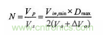 變壓器的變比與變換器的傳輸功率、主電路拓撲結構以及占空比相關。越大,變壓器原邊的電流越小,原邊總的損耗越小,同時副邊整流管要承受的電壓應力也越小,變壓器的效率越高。同時,應能滿足在所有輸入電壓范圍內都能得所需要的輸出電壓,因此,在計算變壓器變比的時候應考慮在最小輸入電壓情況下輸出滿載且占空比最大進行。