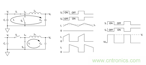 圖 5:Buck 調節器原理簡圖及其工作波形傳導 EMI。