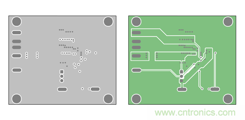 現在,我們以 Maxim 的喜馬拉雅 MAX17502 寬輸入范圍 IC 為例,器件工作在 4.5-60Vin、0.9- 54Vout,提供 1A 負載電流。以下為 MAX17502 EMI 評估板 PCB 的布局,采用了法拉第屏蔽技術 (b)。圖 11a 所示為頂層和底層,用作法拉第屏蔽;圖 11b 所示為內部第二層和第三層,用于布線。這里的第二層用作額外屏蔽,也可用于布線。該布局中,高 di/dt 電流環路 I1 和 I2 布置在第三層, 被完整籠罩在法拉第屏蔽中。