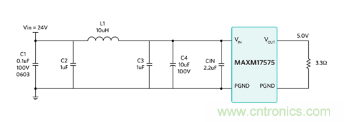 MAXM17575 本質上具有極低的輻射 EMI。對于輻射測試,傳導 EMI 測試中所示的輸入濾波器不需要也沒有使用。使用輸入濾波器能夠為輻射測試提供更大的裕量。