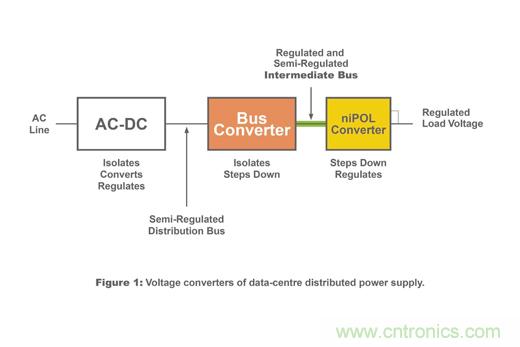圖字:交流線路;隔離、轉換、穩壓;半穩壓配電總線;總線轉換器;隔離、降壓;穩壓半隔離中間總線;niPOL轉換器;降壓、穩壓;穩定負載電壓