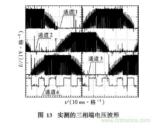 圖13為實測的三相端電壓波形(通道1~通道3) ,通道4的上升沿和下降沿分別對應過零點和換相點.
