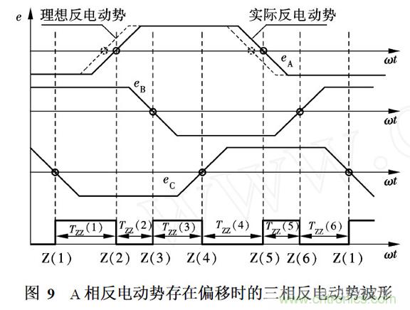 假設A 相反電動勢存在相位偏移, 波形上升和下降部分上的過零點滯后出現,導致過零點在時間軸上分布不均勻. 如圖9所示, 虛線表示理想反電動勢,實線表示存在相位偏移的實際反電動勢,過零點的間隔時間TZZ (1) , TZZ ( 2)和TZZ ( 3)不相等. 每相反電動勢波形上升和下降部分的2個過零點相差180°電角度, 過零點間隔時間存在著周期性規律,如TZZ ( 1) =TZZ ( 4) , TZZ ( 2) = TZZ ( 5)和TZZ (3) = TZZ (6) .