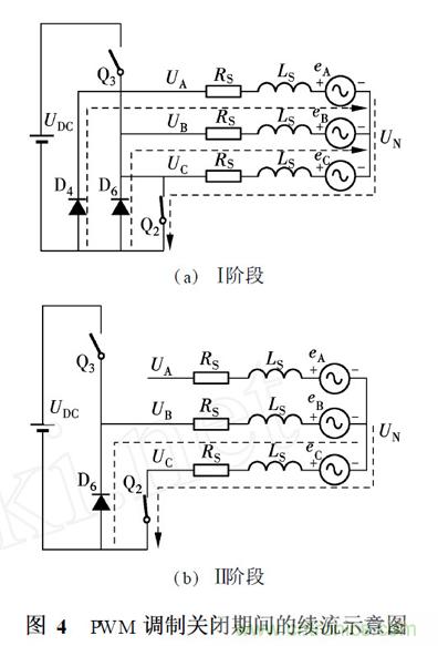 AC 和AB 區為A 相上橋臂開關PWM 調制階段. 以AC區為例,在PWM 開通期間, Q1 和Q2 導通, A 相繞組與直流側電壓的正極相連, 端電壓為UDC ;在PWM 關閉期間, Q1 關閉, Q2 導通,由于繞組阻抗呈感性, A 相下橋臂的反并聯二極管D4 導通續流,此時A 相繞組與直流側電壓的負極相連,端電壓為零.