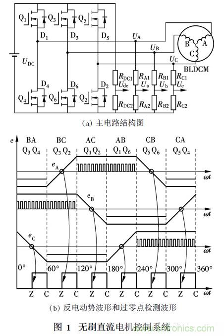 本文采用基于端電壓的直接反電動勢檢測電路,通過檢測懸空相繞組的端電壓信號來獲得反電動勢過零點. 采用分壓電阻對端電壓和直流側電壓進行同比例分壓,使分壓后的被測信號落在采樣單元允許的輸入范圍內. 圖1 ( a)為主電路和直接反電勢法分壓電路,端電壓UA , UB , UC 和UDC經過分壓后分別為Ua , Ub , Uc 和Udc.