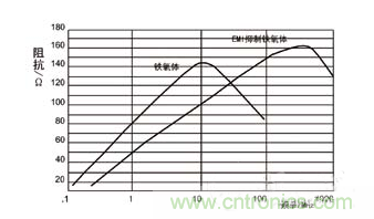 鐵氧體的效果隨著頻率的升高而增加。鐵氧體扼流圈的阻抗在10MHz處通常為幾十歐姆,當(dāng)頻率超過(guò)100MHz時(shí),阻抗升高到數(shù)百歐姆(具體值取決于形狀和尺寸,鐵氧體體積越大,阻抗越大)。不同廠家的產(chǎn)品或同一廠家的不同種類的鐵氧體,其阻抗隨頻率的變化都有所不同。圖5是尺寸相同(外徑為5mm,長(zhǎng)度為11mm)但材料不同的兩種鐵氧體的特性。