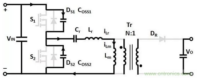 T1時刻,S1關斷,(Coss1+Coss2)和(Lr+Lm)諧振,Coss1充電,Coss2放電,直到T2時刻,Coss1的電壓充電到VIN,Coss2的電壓放電到0。