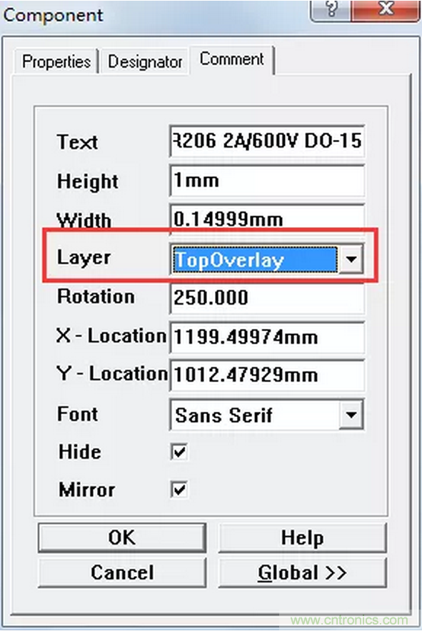 D1這個(gè)元件有個(gè)文字描述的屬性放在了頂層銅箔,如圖