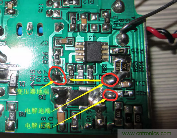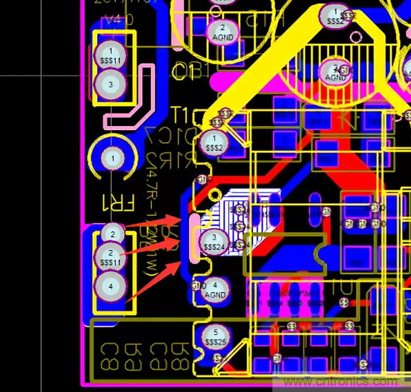二:Y電容回路走線越短越好先經(jīng)過變壓器地再回到大電容地,不與其它信號線交叉;