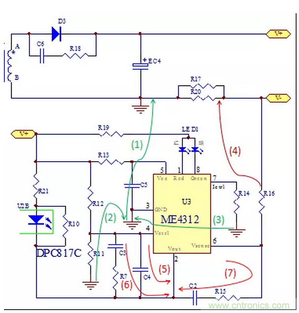 如(1)(2)(3)綠線所示,R11的地和R14的地連接到芯片的地,再連接到EC4電解電容的地。注意不可連到變壓器的地,因?yàn)樽儔浩鞔渭堿->D3->EC4->次級B形成功率環(huán),如果ME4312芯片的地接到次級B線到EC4電容之間,受到較強(qiáng)的di/dt干擾會導(dǎo)致系統(tǒng)的不穩(wěn)定等因素。