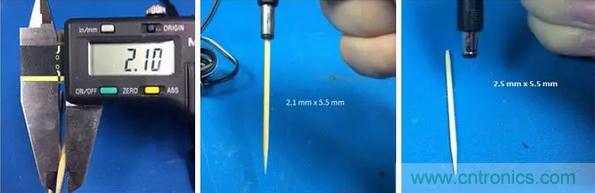 顯然,用一把尺子或者游標卡尺(如果手邊有的話)來準確測量或辨別2.1mm或者2.5mm的小孔內徑是很難的。這就留給我們兩個選擇: