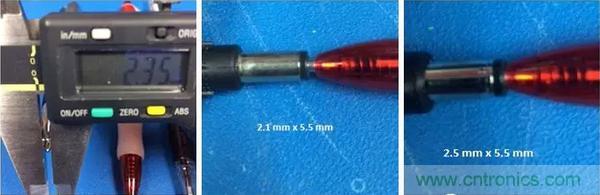 這個技巧有點小竅門。大多數測試探針你會發現其直徑都是2mm的,這也就意味著,2.1mm和2.5mm內徑的接頭都可以插進去。所以,就需要觀察一下探針和孔洞內壁間是否有明顯縫隙。測試探針插入2.1mm接頭時孔洞內壁和測試表筆頭間無明顯間隙,但2.5mm接頭和測試筆頭就有明顯縫隙。