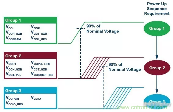 市場中較新的FPGA在規格中會提供針對啟動和關斷電源時的序列順序提出特定的要求,確保FPGA正常開啟及復位,保持最小的電流消耗,并在電源轉換期間將I/O保持在正確的三態配置下。再以Arria 10為例,其技術規格將電源分為三個序列組(1、2、3),并要求它們按升序排列為1、2、3,然后按相反的順序降序排列:3、 2、1。