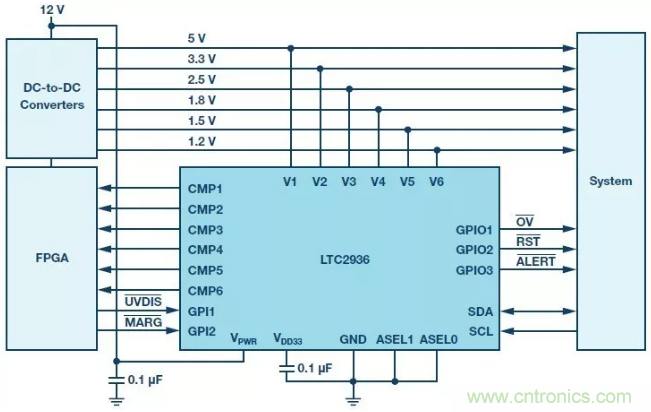 例如ADI公司的LTC2936可以提供六個可編程閾值模擬比較器,用于檢測快速事件并將數字狀態發送到邏輯。該器件還有三個可編程GPIO引腳,可提供額外的功能。該可編程IC包括EEPROM,后者可在啟動時近乎即時地工作;該IC還能通過其I2C/SMBus接口存儲故障遙測數據以便進行調試。