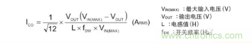 輸出電容器的紋波電流如上圖的ICO所示是三角波,而其實效值則用下面公式表示。