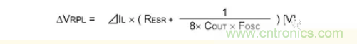 輸出紋波電壓是通過上圖的電感電流IL紋波ΔIL和輸出電容器的容值、ESR、ESL所產生的電壓合成波形,用下面公式表示。