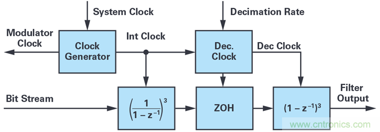 傳統的三階sinc濾波器如圖1所示。濾波器通過按比例縮放系統時鐘來生成ADC的調制器時鐘,而ADC則向濾波器返回一個1位數據流。濾波器功能本身包括三階級聯積分器 1/(1 – z–1)(時鐘速率與調制器速率相同)和三階級聯微分器 1 – z–1(時鐘速率為抽取時鐘)。