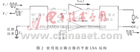 通常,在LNA的設計中主要考慮低噪聲系數(NF)。足夠的增益(G)和絕對的穩定性?對于本文TMA放大器中LNA設計的實際技術規范要求如表1所示。同時要求所使用的LNA結構滿足良好的輸入輸出匹配,保證LNA的穩定性,兼顧到功分/合路網絡的低損耗、幾何尺寸小,工作帶寬內良好的相位和幅度匹配,足夠的工作帶寬(涵蓋在1.95GHz左右),符合CDMA標準上行頻率?據此選擇了以平衡結構為特征的LNA結構(如圖2)。這種平衡結構的重要特性是:它較單階放大器的截點高出一倍,并以標準50Ω實現輸入輸出匹配,在某一路硬件失效時電路的冗余設計可保證系統的正常運行。但通常增益減少6dB。