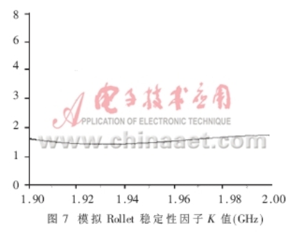 除了能夠得出增益、NF、P1dB和輸入輸出回波等重要參數外,軟件模擬還能夠得出關于電路設計穩定性的信息。它是電路能否正常工作的重要前提。模擬軟件計算Rollet穩定性因子K和作穩定性圓是兩種很容易做到的方法,它們可以明確地表示出穩定性的數據。圖7示出的Rollett穩定因子K的模擬值(K>1)表明:在1.9~2.0GHz工作帶寬范圍,電路能夠實現無條件穩定。