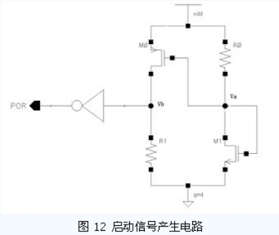 該電路仍然存在的靜態功耗的問題,可以通過增大電阻值,合理選擇MOS 管尺寸來降低靜態功耗的影響。要想完全解決靜態功耗的問題則需要設計額外的反饋控制電路,在啟動信號產生后關斷這部分電路。但是,需要特別注意引入反饋后產生的不穩定態的問題。