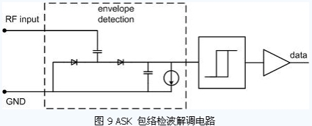出于減小芯片面積和功耗的考慮,目前大部分無源RFID 標簽均采用了ASK 調制。對于標簽芯片的ASK 解調電路,常用的解調方式是包絡檢波的方式,如圖9 所示。