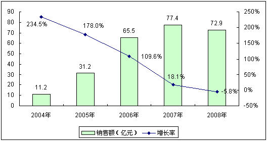 圖2 2004-2008年中國安防領域RFID市場規模與增長(銷售額)