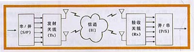 移動(dòng)通信環(huán)境中存在多個(gè)散射體、反射體,在無線通信鏈路的發(fā)射與接收端存在多條傳播路徑,多徑傳播對通信的有效性與可靠性造成了嚴(yán)重的影響。研究表明,可以利用多徑引起的接收信號的某些空間特性實(shí)現(xiàn)接收端的信號分離。多輸入一多輸出(MIMO)技術(shù)在通信鏈路兩端均使用多個(gè)天線,發(fā)端將信源輸出的串行碼流轉(zhuǎn)成多路并行子碼流,分別通過不同的發(fā)射天線陣元同頻、同時(shí)發(fā)送,接收方則利用多徑引起的多個(gè)接收天線上信號的不相關(guān)性從混合信號中分離估計(jì)出原始子碼流(見圖4)這相當(dāng)于頻帶資源重復(fù)利用,可以在原有的頻帶內(nèi)實(shí)現(xiàn)高速率的信息傳輸,使頻譜利用率和鏈路可靠性極大的提高。MIMO系統(tǒng)提供分集增益(diversitygain)和復(fù)用增益(multiplexinggain)。