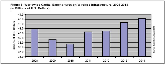 圖5所示為iSuppli公司對(duì)2008-2014年全球無線基礎(chǔ)設(shè)施設(shè)備資本支出的預(yù)測(cè)。